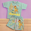 The t-shirt is green and has bambi on it with the line "bambi ".
