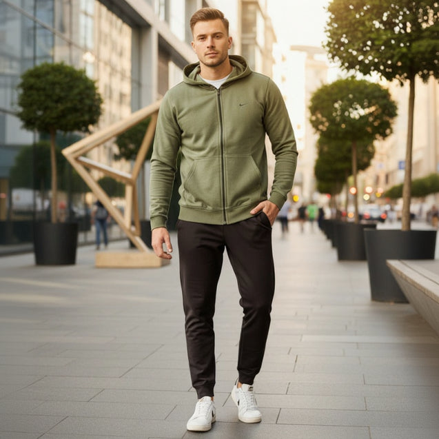 Stylish olive green zip hoodie with matching black pants